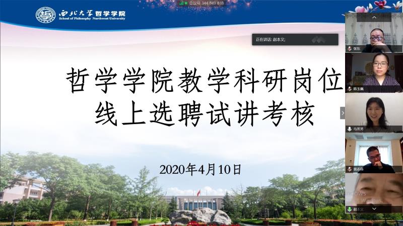 当前,正值新冠肺炎疫情防控关键时期,我院结合疫情防控部署特点,于4月10日14:30通过网络平台进行博士毕业生选聘试讲。校教学督导赵本义教授、院党委李波书记、院长张学广教授、副院长耿建、魏哲铭教授、王雪梅教授、刘宇教授、刘莹副教授、袁志伟副教授和孙明哲老师作为专家组成员参加了本次试讲活动。活动由张学广院长主持。
